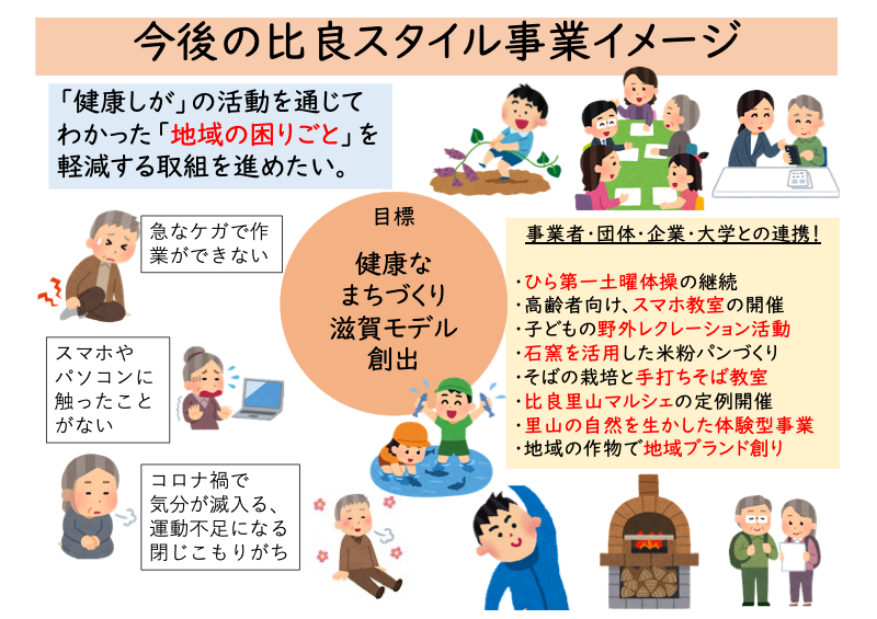 また、令和3年度は滋賀県「健康しが」活動創出支援事業に参画し「里山でボラ活、健康な仲間づくり」を実現する「比良スタイル事業」に取り組みました。今後もさまざまな地域課題に取り組み、比良の地域活性化に貢献したいと考えています。
