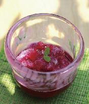 凍らせた比良ペリラをミキサーでクラッシュし、ヨーグルトを入れてひとまぜ。これで冷たい赤シソスムージーの完成です。